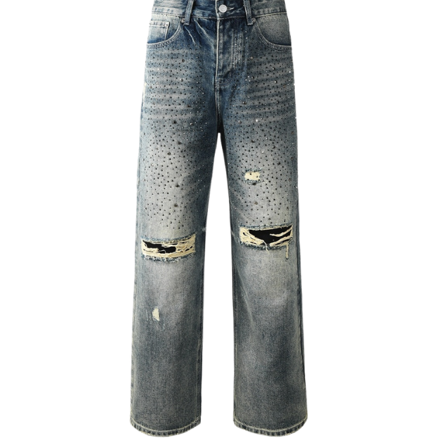 Los jeans anchos de mezclilla con pedrería y rotos ofrecen un estilo moderno y atrevido, ideal para quienes buscan destacar con personalidad. Confeccionados en denim de alta calidad, presentan un corte amplio que brinda comodidad y libertad de movimiento. Los detalles de pedrería y los rotos cuidadosamente diseñados aportan un toque urbano y sofisticado a cualquier look.